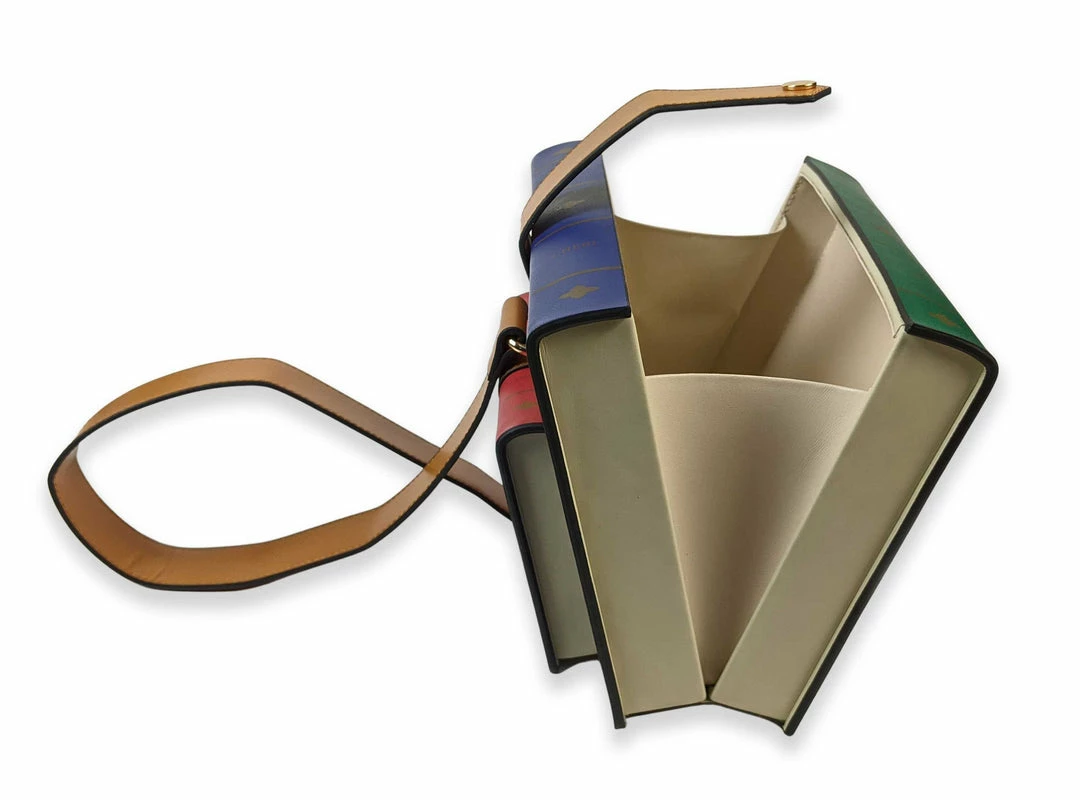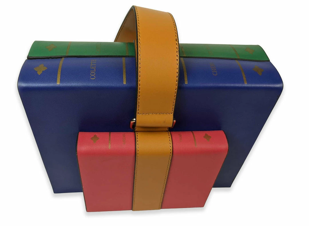 This unique faux leather purse is sure to be a conversation piece wherever you go. Contains two large books in cobalt blue and forest green and a small book in red. The larger books open to reveal a spacious off-white interior with a small pocket. A cognac brown book strap acts as a two-position adjustable handle.