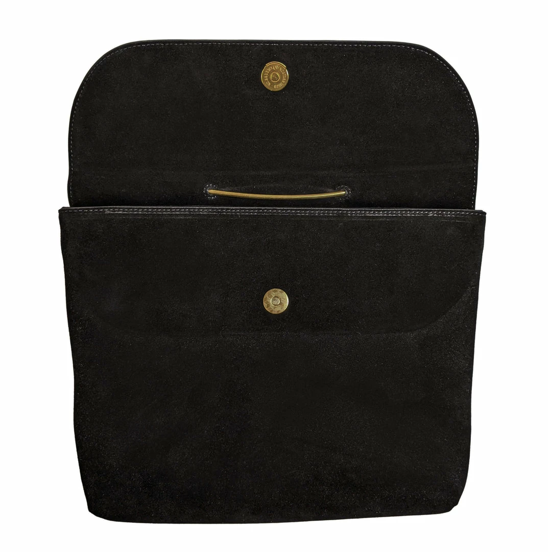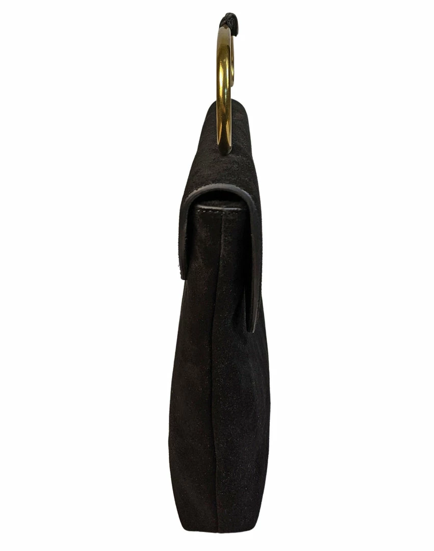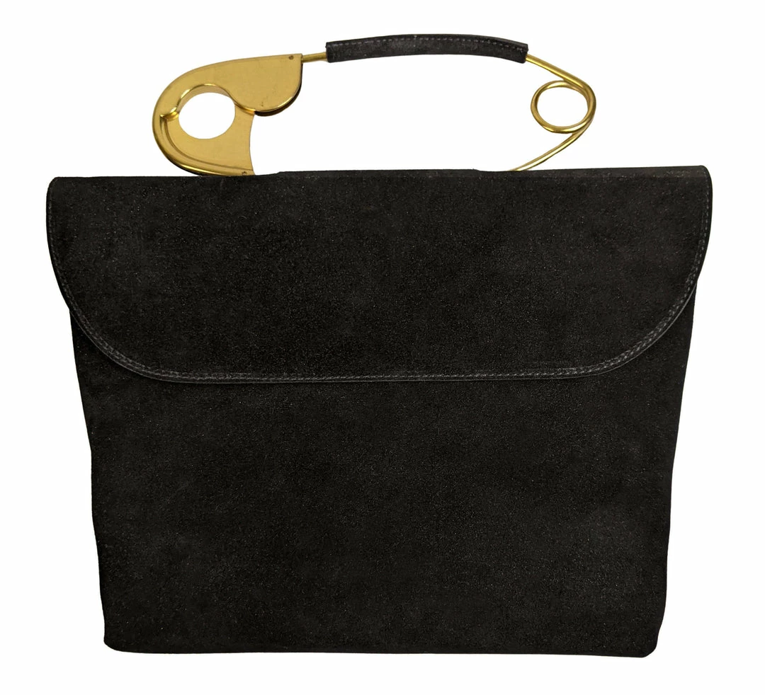 Made of genuine black suede with a large gold-tone safety pin handle. A strip of suede wraps around the handle for comfort while carrying. The inside features two regular pockets and one zippered pocket and my signature metal logo. A magnetic clasp keeps your items safe.