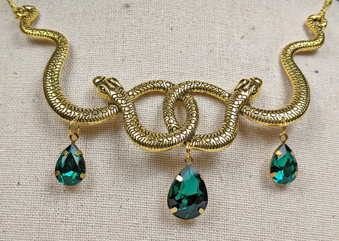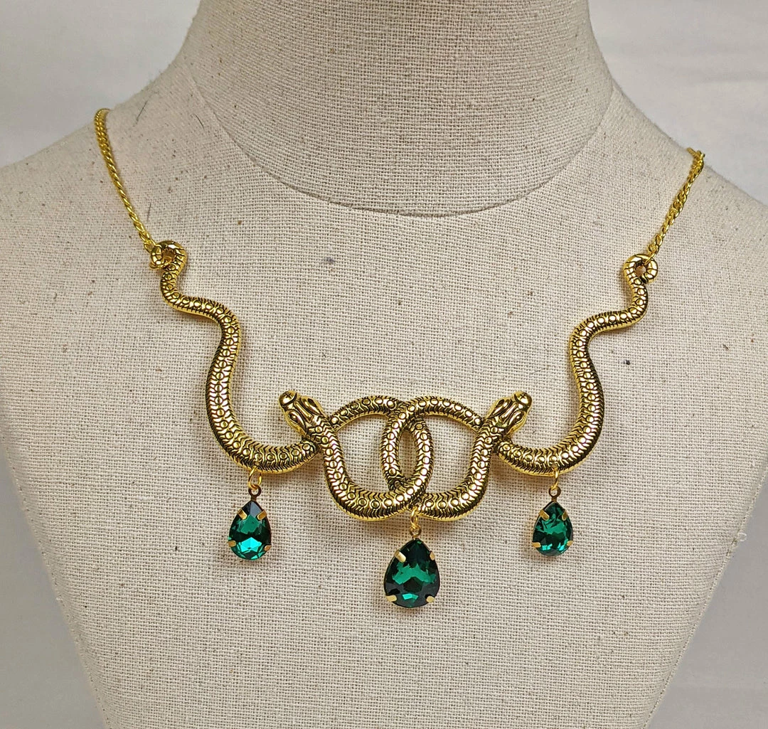 Gold-tone snake necklace accent with deep emerald color teardrop shape rhinestones.