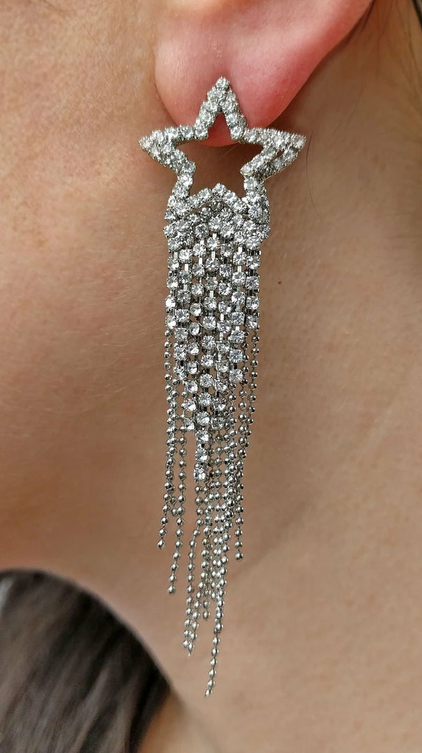 Silver-tone earrings feature an elegant rhinestone star with a cascade of rhinestones below to create the effect of a dazzling shooting star.