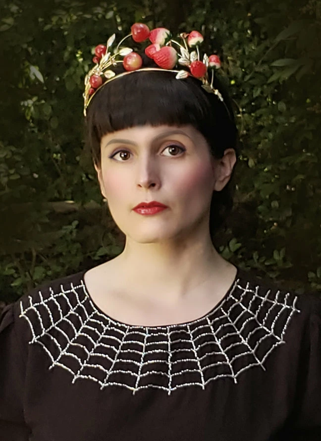 The “Charlotte” dress has a hand beaded spider web collar embellishment done in silver seed beads. Based on a style from the late 1930s and early 1940s with puff sleeves, an a-line skirt, and a vintage style metal zipper at center back. Features two cute pockets on the front and ties that cinch the waist from the back to create a flattering silhouette. Made of 100% black rayon, fully lined.