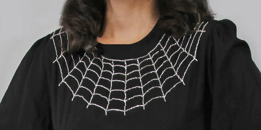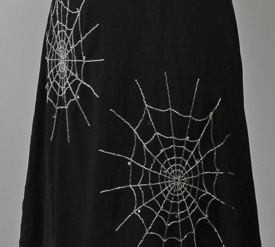 Features two large hand-beaded spider webs on the skirt and a large hand-beaded collar. The dress has voluminous bishop sleeves and is made of 100 percent rayon. Center back metal zipper. Tiebacks to cinch the waist. The body of the dress is fully lined.