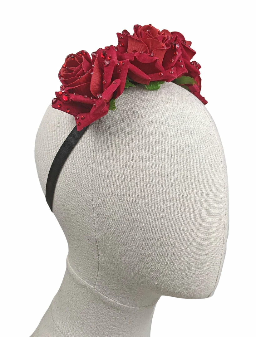 A light and flexible elastic strap headband with five lush red fabric roses. Hand placed rhinestones make each a one of a kind creation.