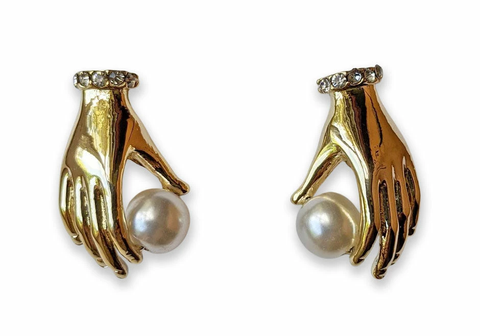 Each hand holds a faux pearl accented with cuffs of rhinestones at the wrists.