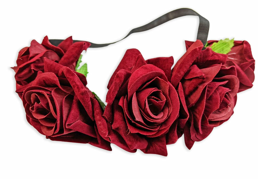 Velvety burgundy colored roses headband. Elastic expands to fit head.