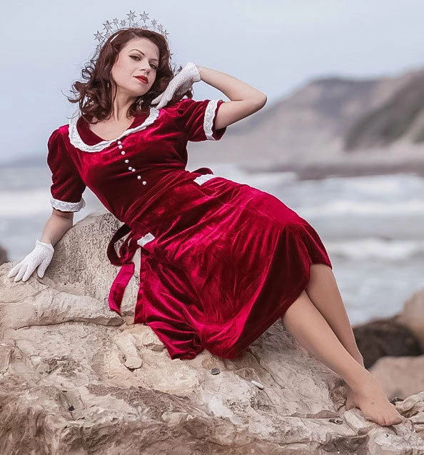 Made of rich burgundy red velvet with a hint of stretch. Inspired by dresses from the 1930s and early 1940s. Features a Peter Pan collar, puff sleeves, vintage-style metal side zipper, front pockets trimmed in vintage style lace, ornamental faux-pearl buttons, and tie-backs to cinch the waist.