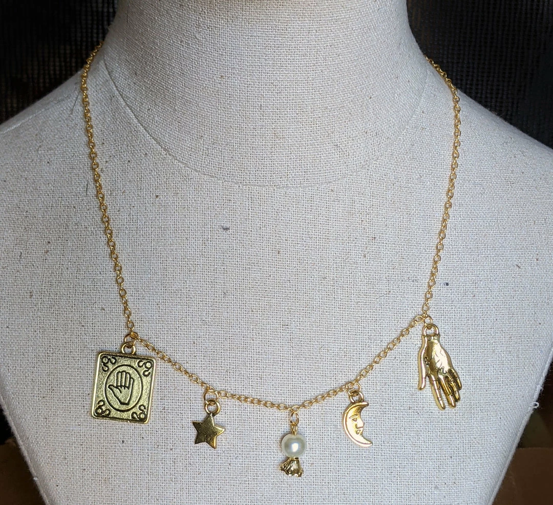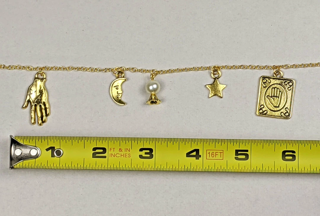 Fortune telling themed necklace with five charms including a moon, hand, crystal ball, card, and star. Approximately 20″ in length.
