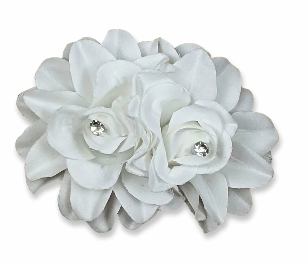 Double gardenia hair clip accented with a rhinestone in the middle. Alligator clip on back.