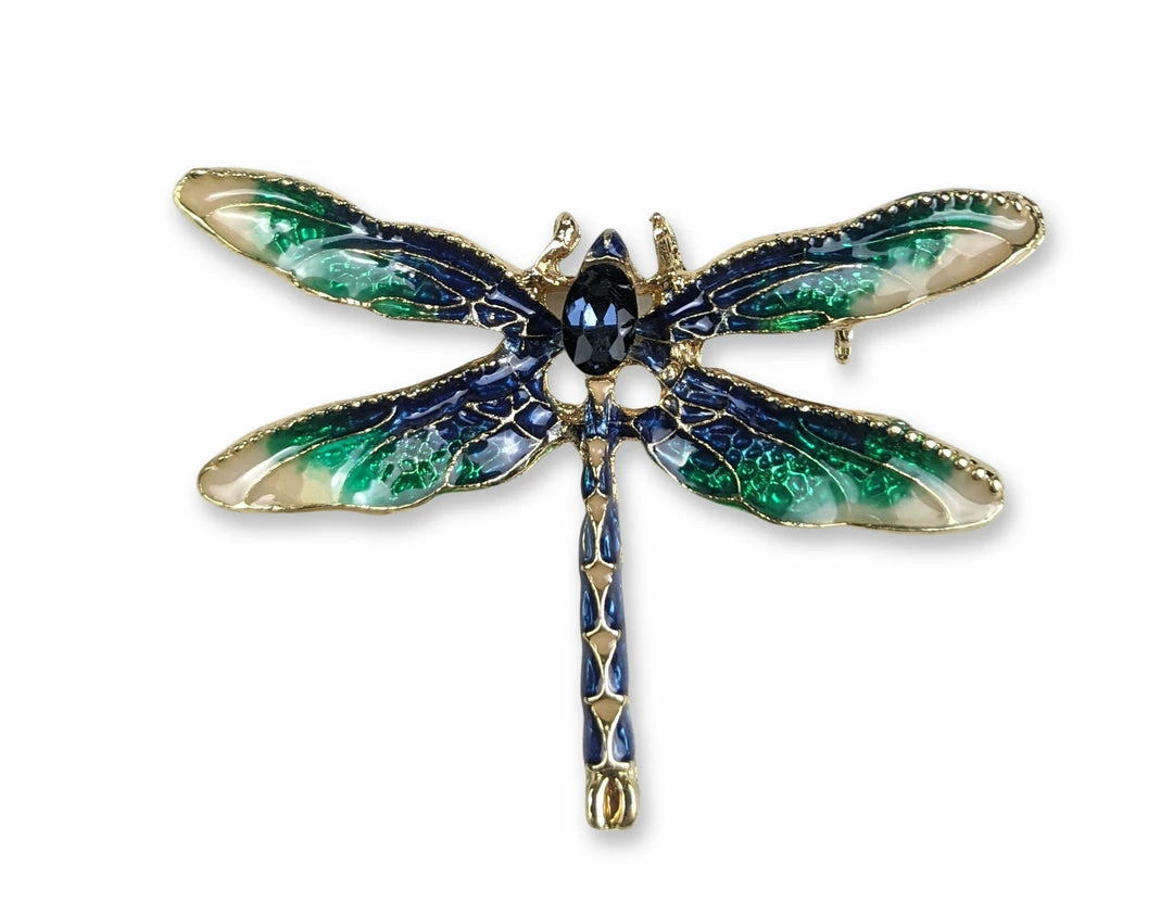 Enamel dragonfly brooch accented with a deep blue teardrop shaped rhinestone.