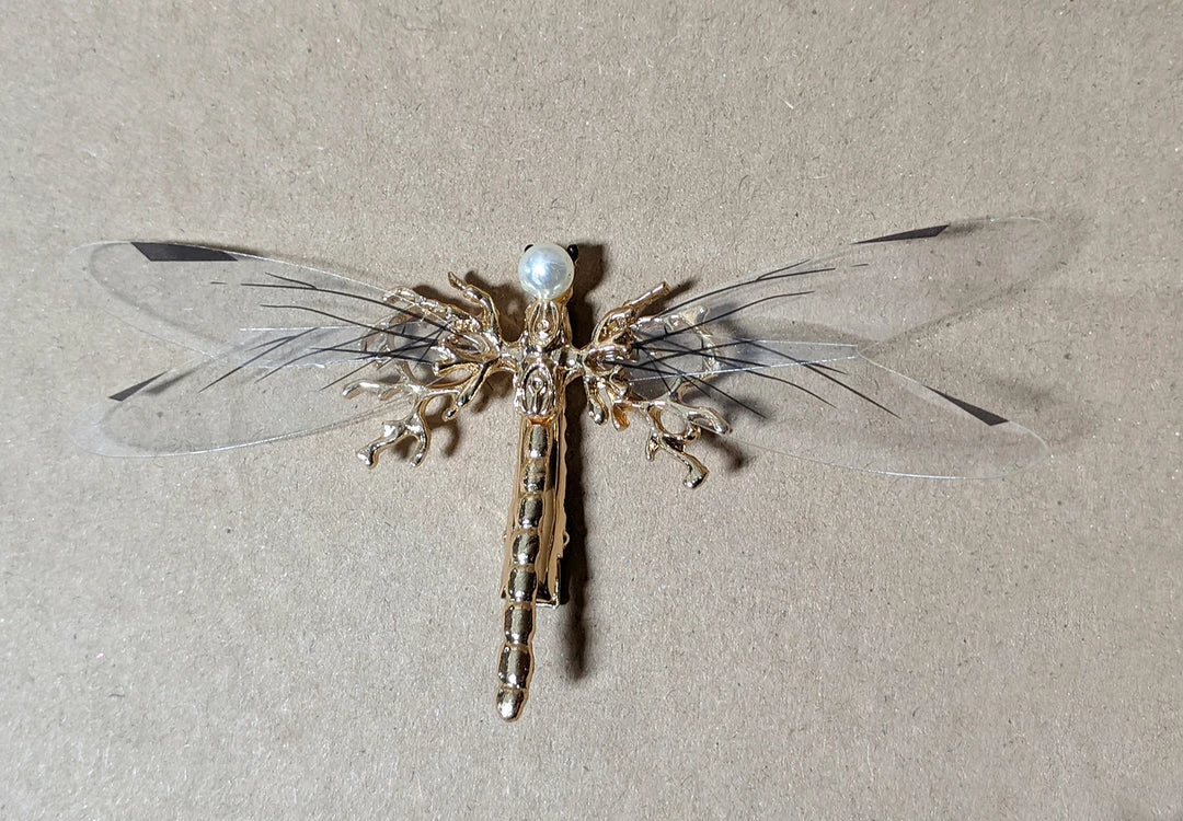 Gold-tone dragonfly barrette with a faux pearl accented head and transparent wings.