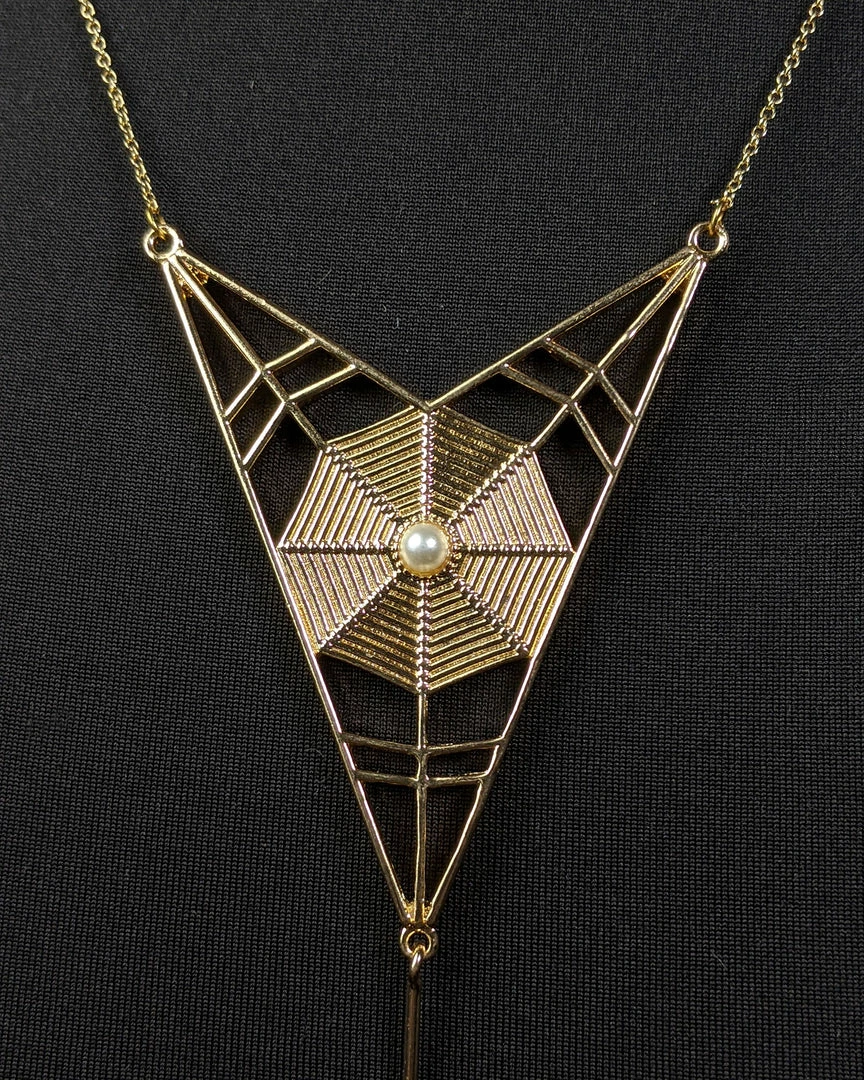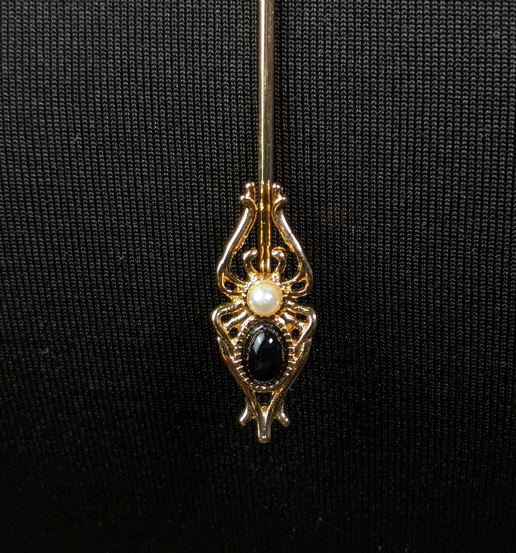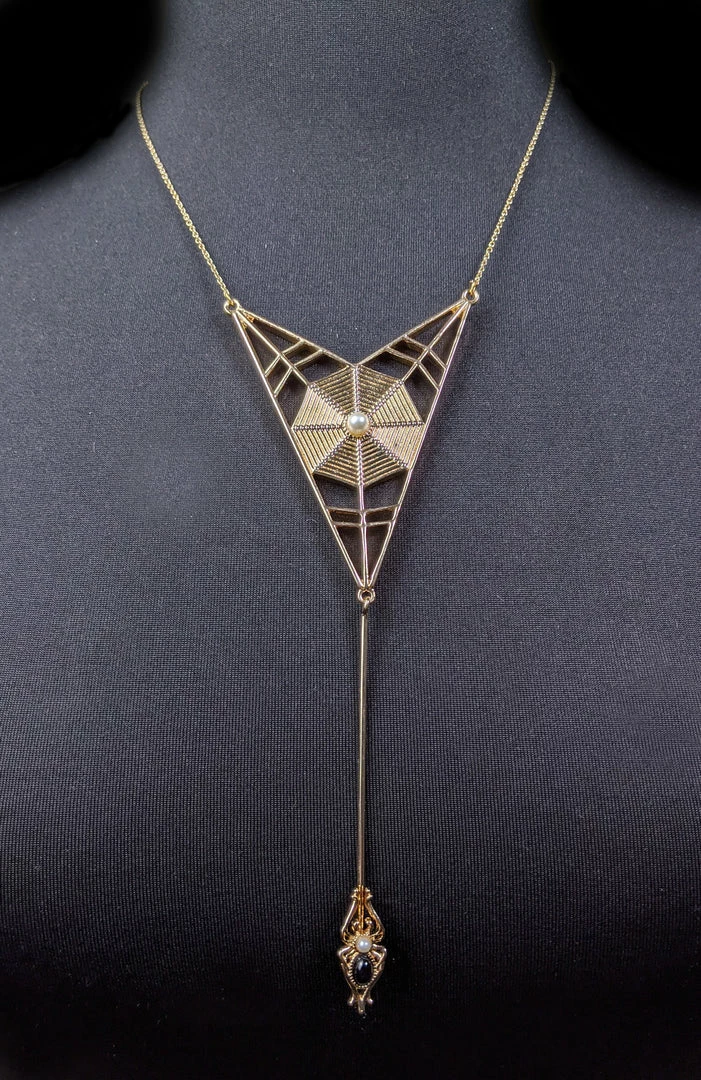 Inspired by one from the Art Nouveau period. Features a gold-tone spider web with a faux pearl at its center. A dramatic spider drops from the web with a black stone and an additional faux pearl.