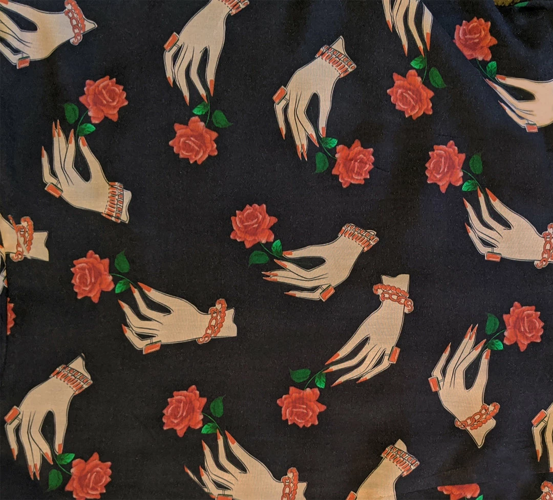 This wonderful Bishop sleeved dress is made of 100 percent rayon “Rosalind” print fabric. An original design inspired by the fabrics of the 1940s. It features hands holding roses on a black background.