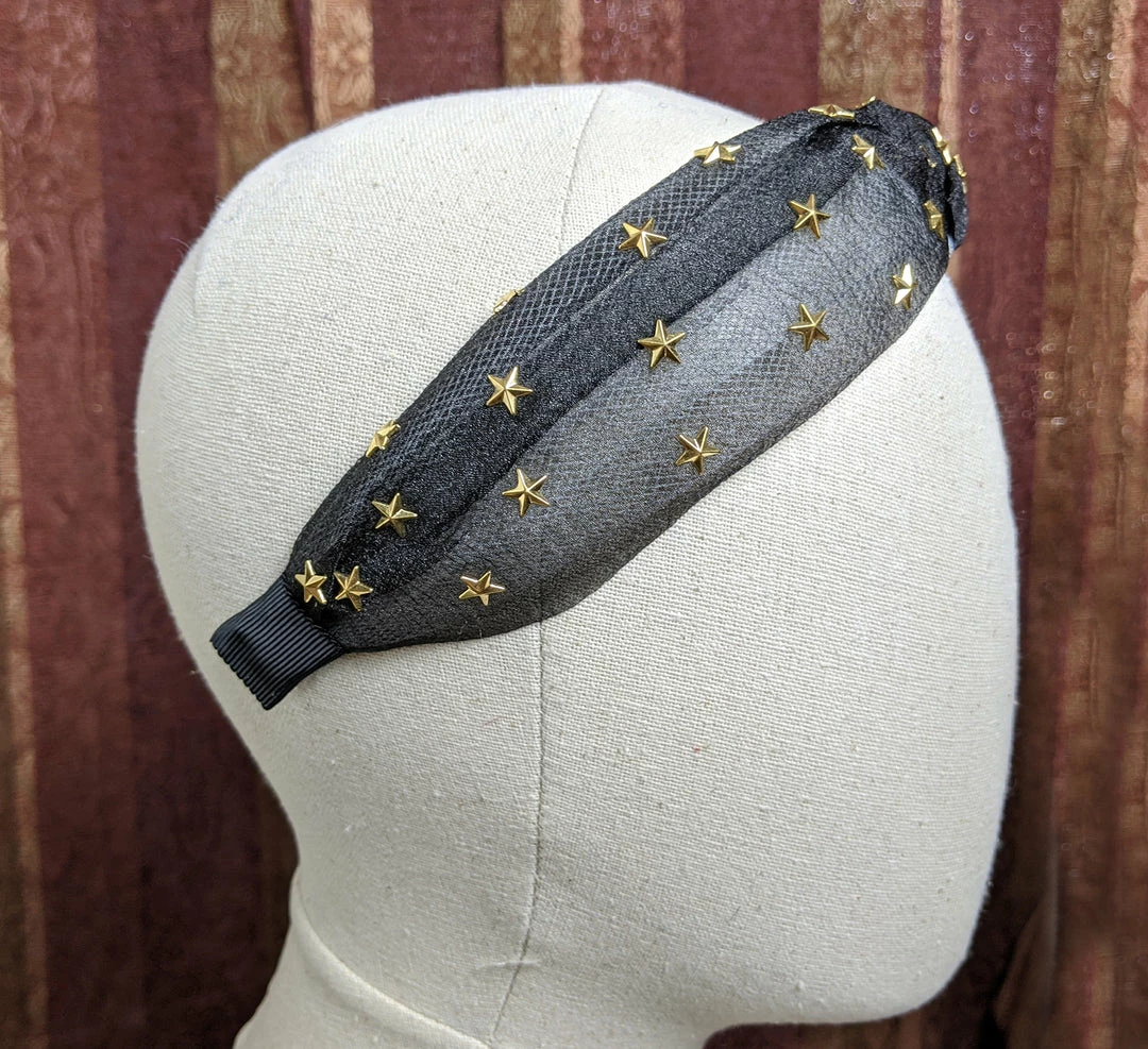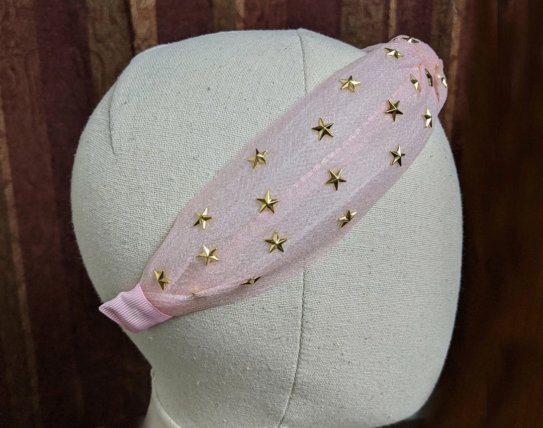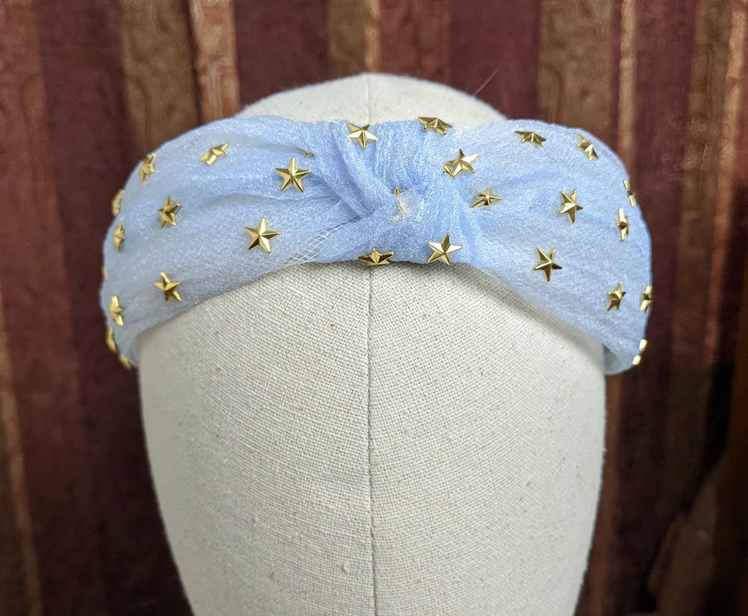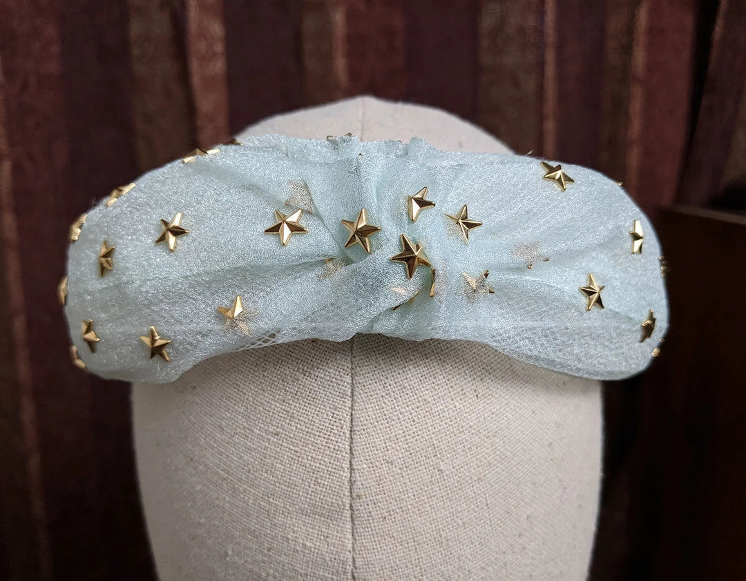 Tulle headband studded with stars with a top knot in the middle. Available in black, powder blue, seafoam, and rose pink.