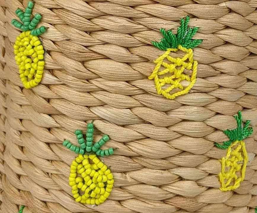 Here’s the fun, new bag you’ve been looking for! The Nia Pineapple Bag is a novelty wicker basket adorned with petite pineapples made from either wicker or beads. The green inner lining is shaped like pineapple leaves and securely stores your belongings. Closes easily with a drawstring
