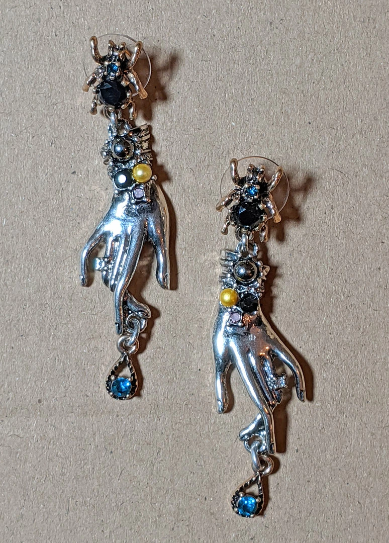 Silver Tone Hand Dangle Earrings Accented With A Variety Of Colored Rhinestones. Height: 2″