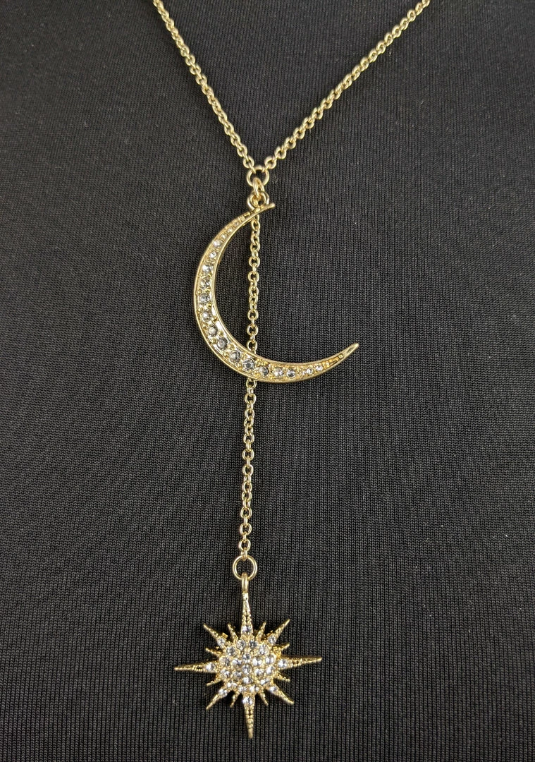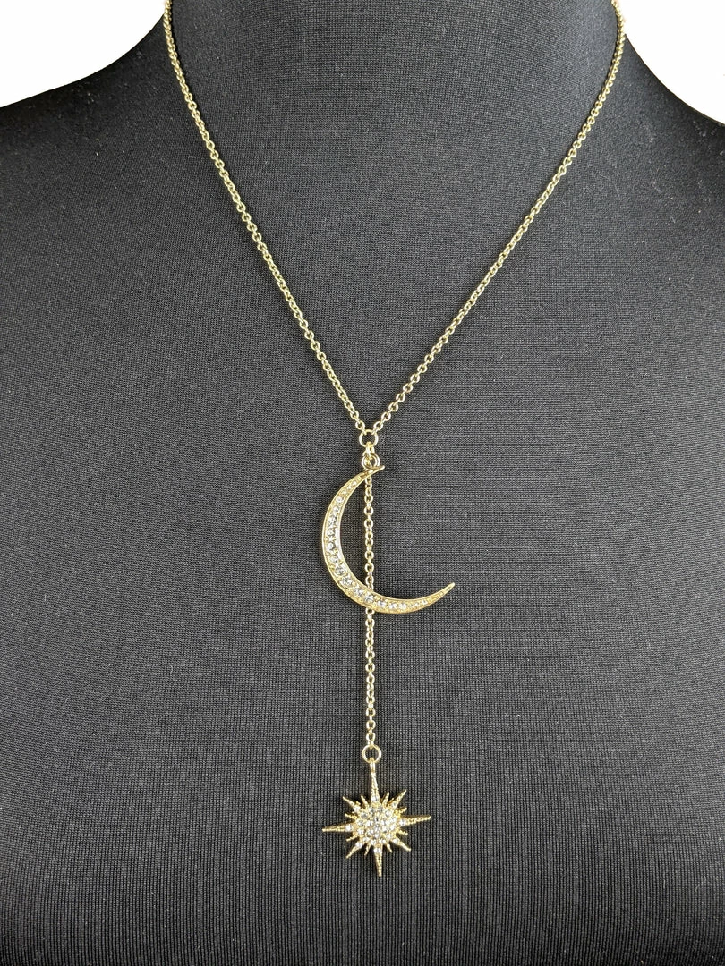 Gold tone celestial theme necklace with a rhinestone accented moon and starburst.